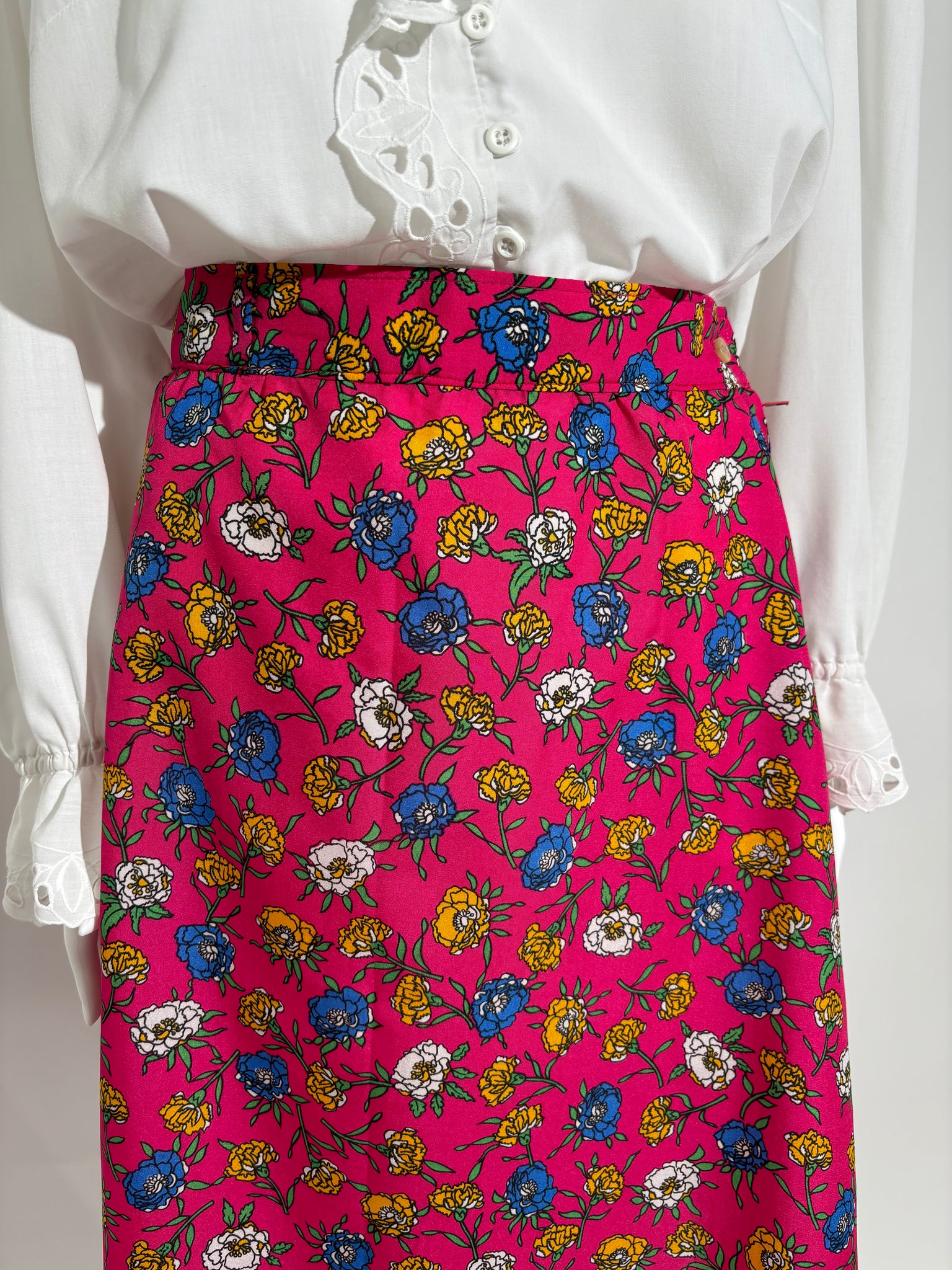Ova cvetna suknja u pink boji iz 90-ih dodaje romantičan i ženstven dodir vašem izgledu. Savršena za prolećne i letnje dane, kao i za ležerne izlaske.