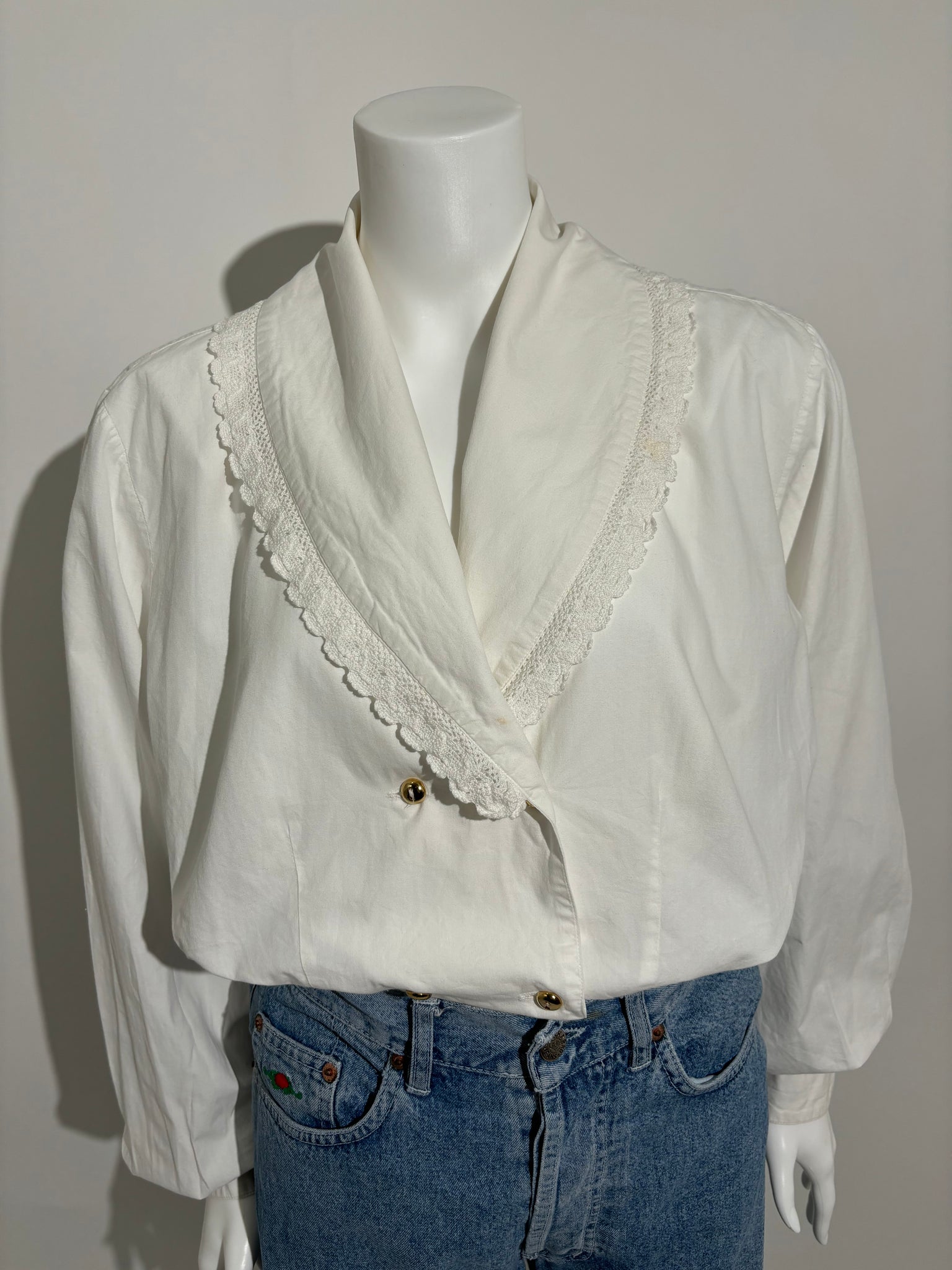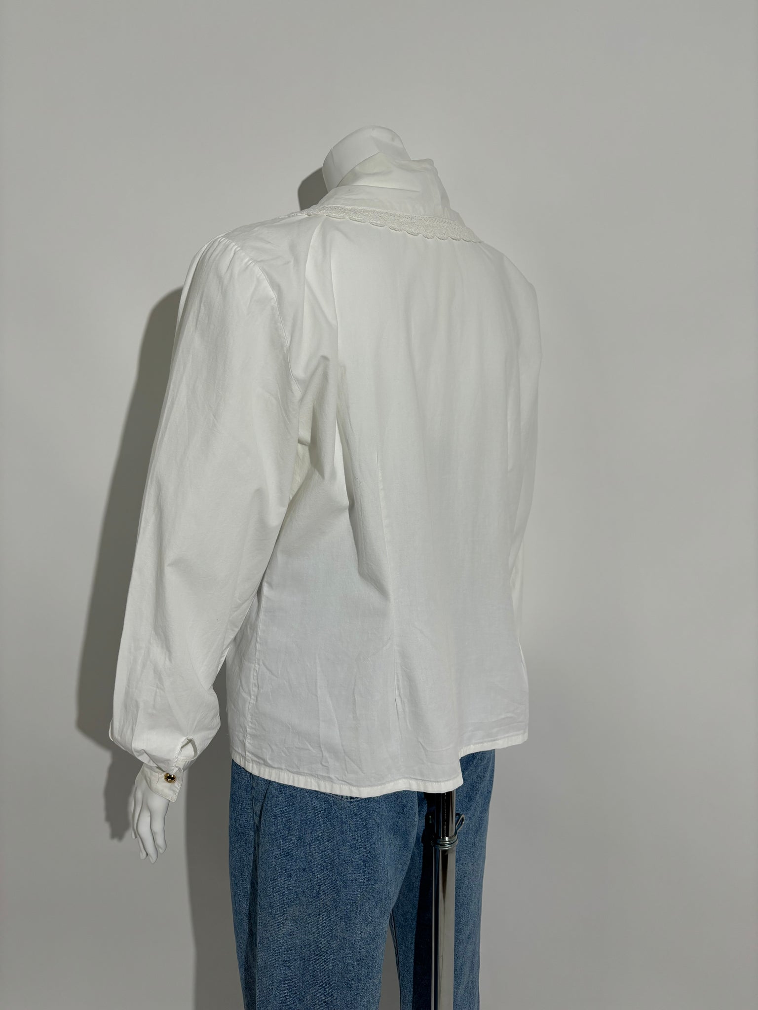 Ova elegantna bluza sa čipkom iz 80-ih donosi sofisticiran i romantičan izgled. Savršena je za formalne događaje i posebne prilike.