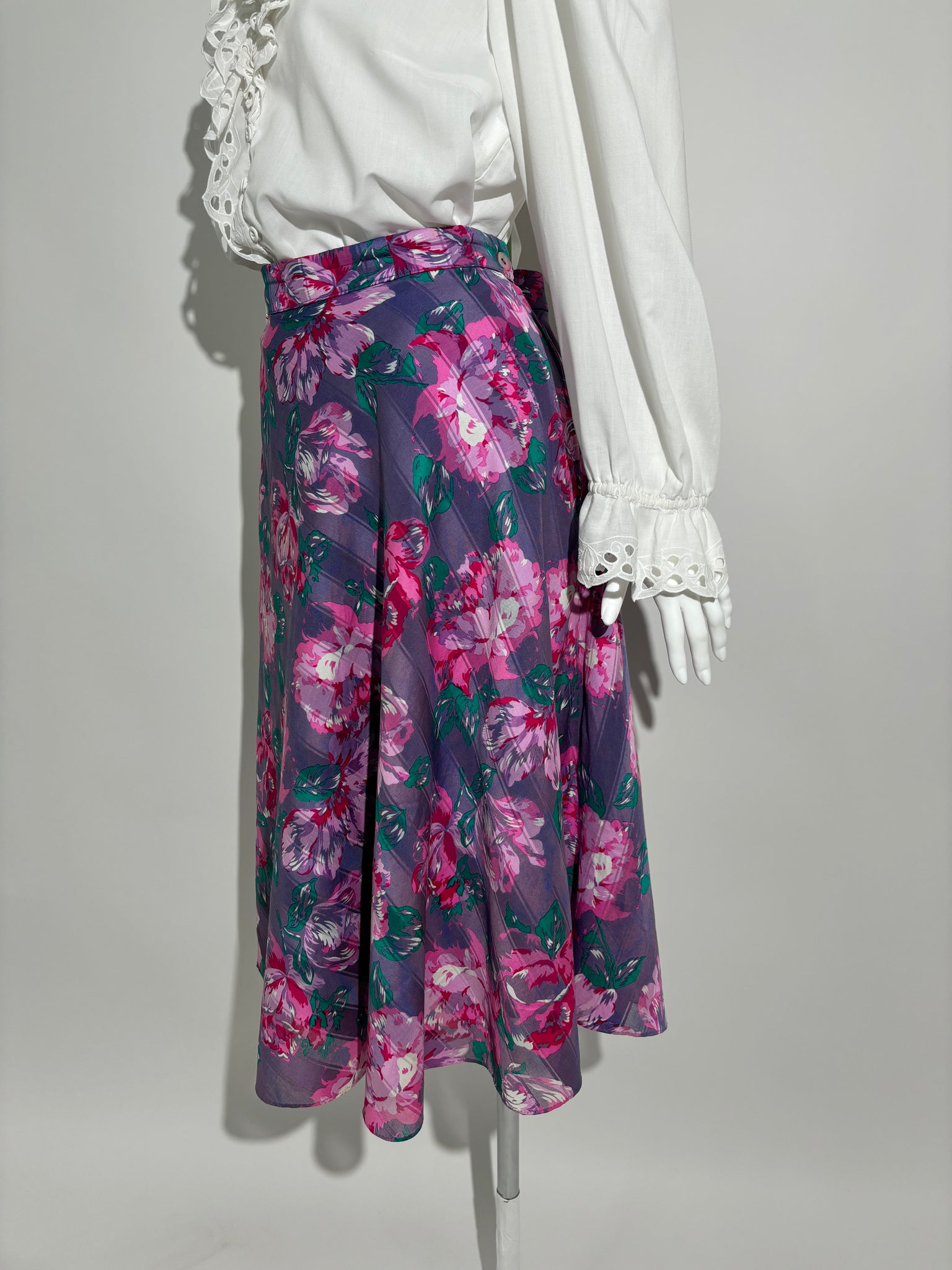 Ova vibrantna ljubičasta suknja sa cvetnim printom donosi dašak 80-ih u vaš garderober. Idealna za sve prilike, ističe vašu jedinstvenost i ljubav prema retro stilu.