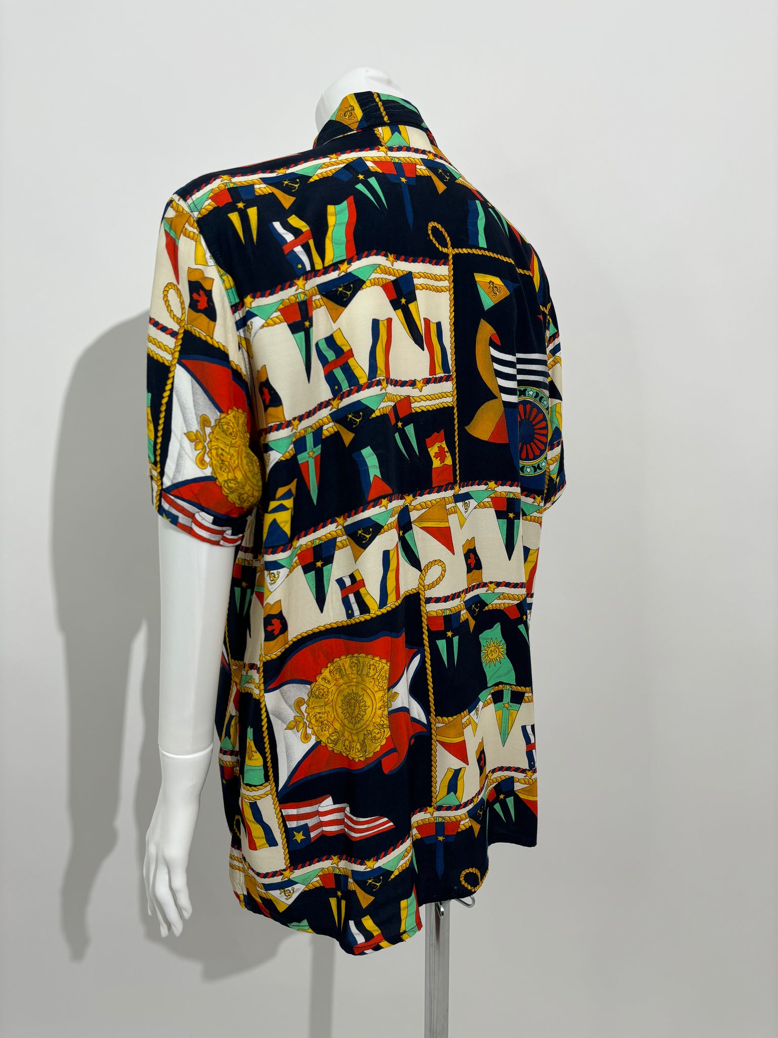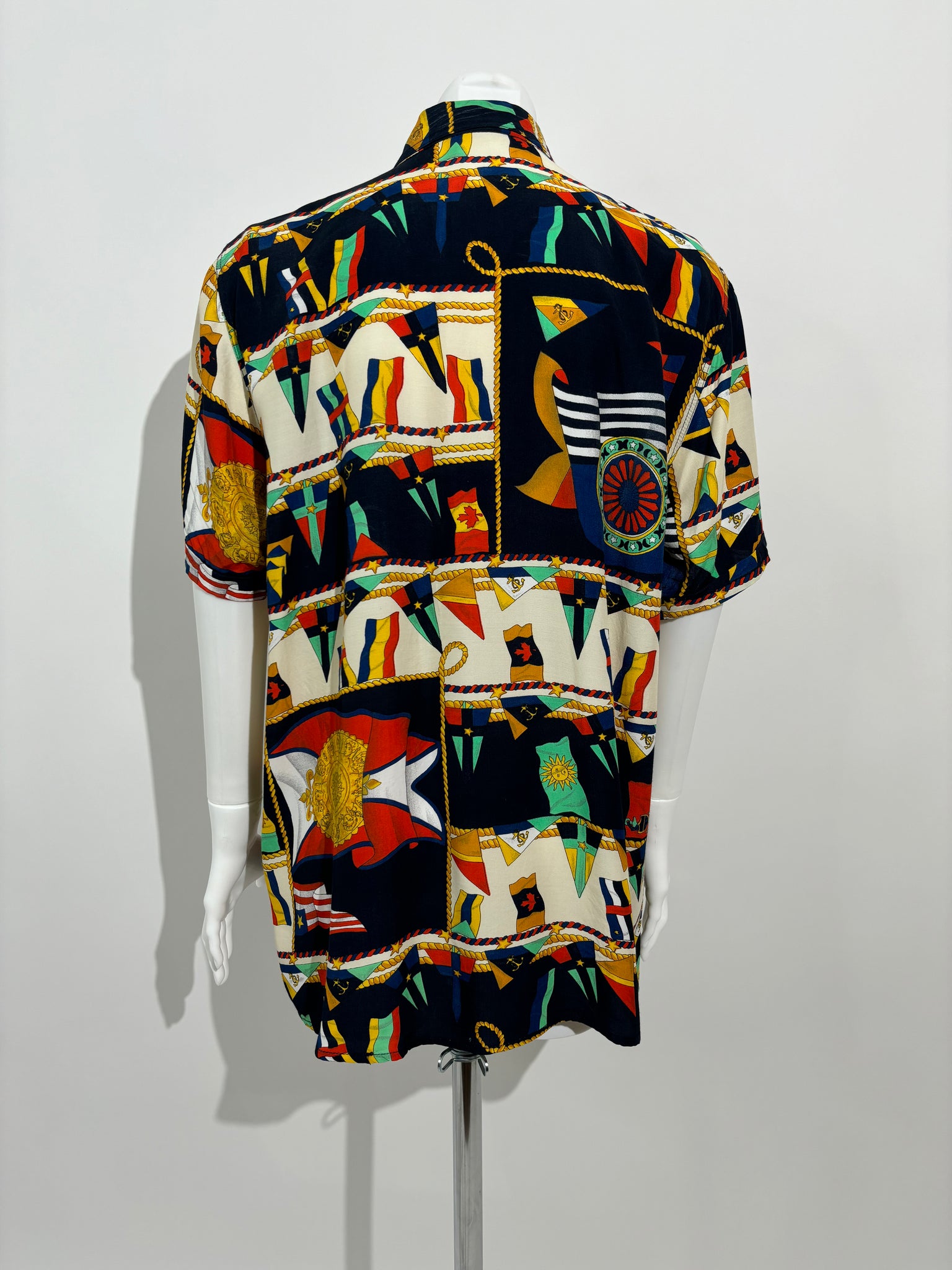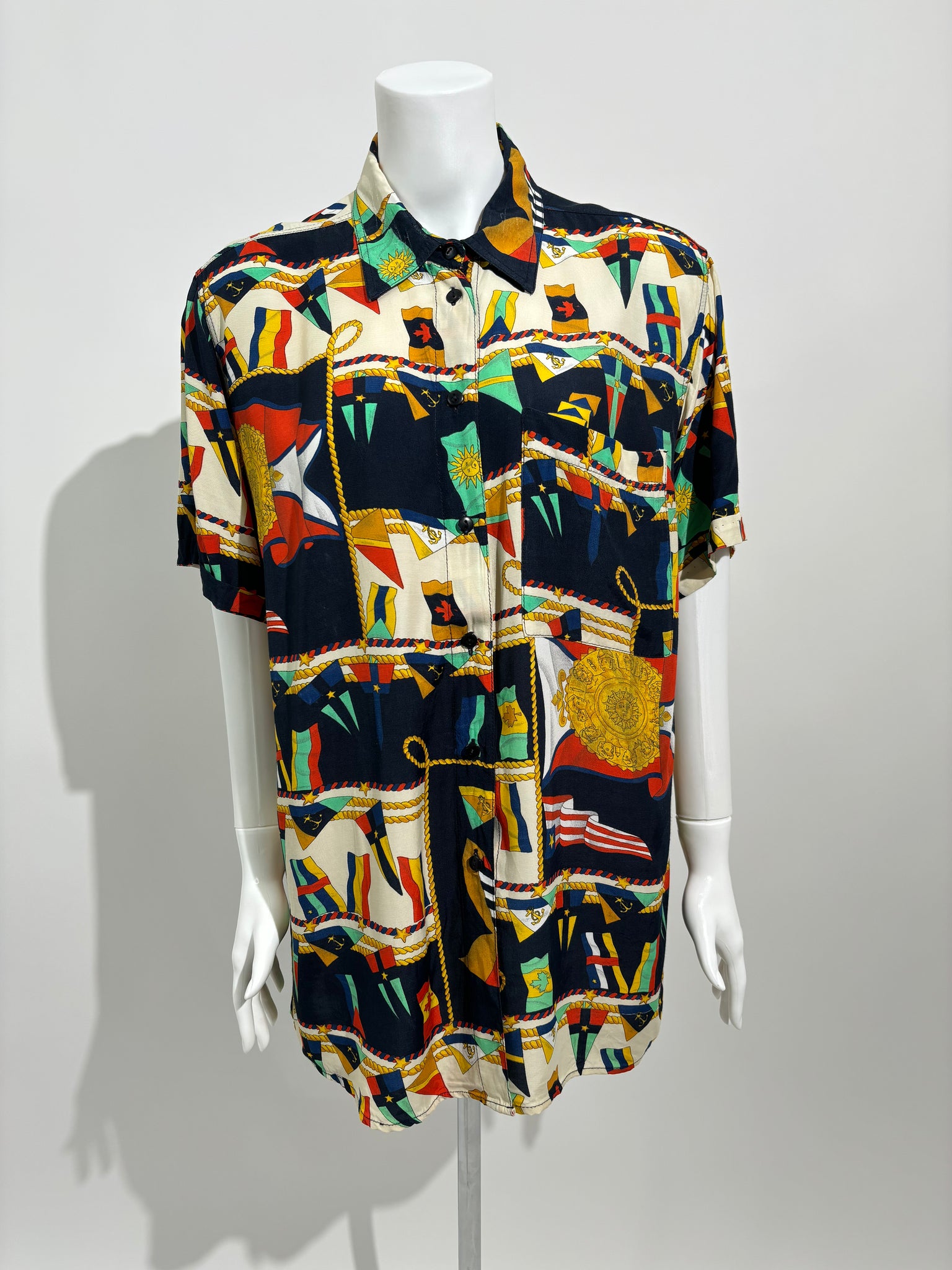 Unesite dašak pomorske avanture sa ovom grafičkom košuljom iz 80-ih sa motivima zastava. Savršena za letnje dane i ležerne prilike.
