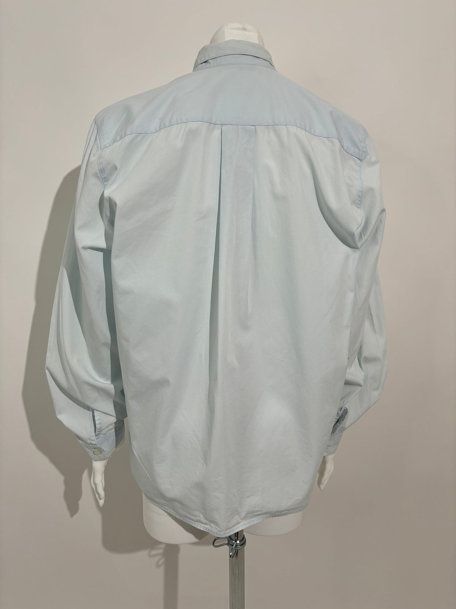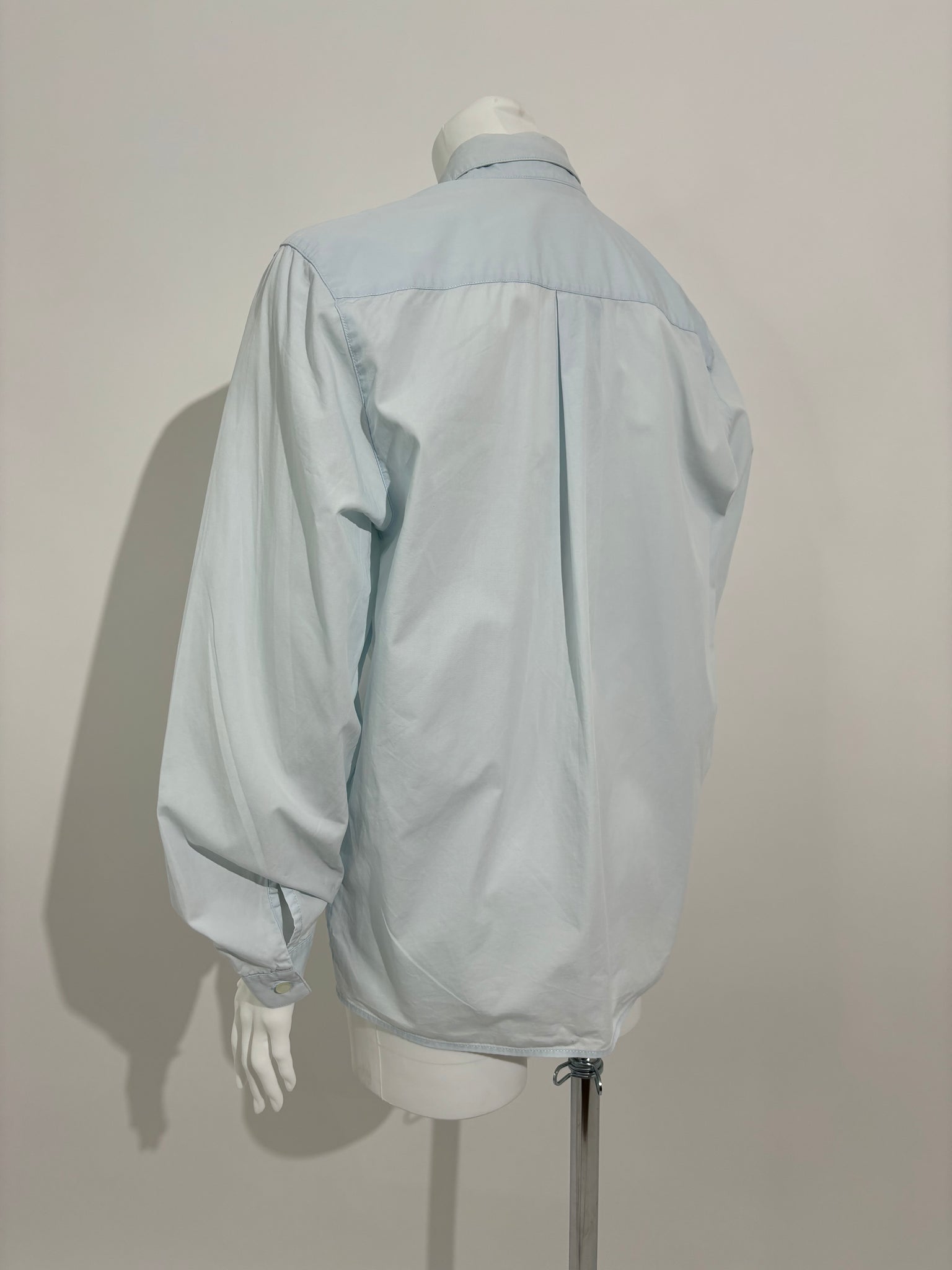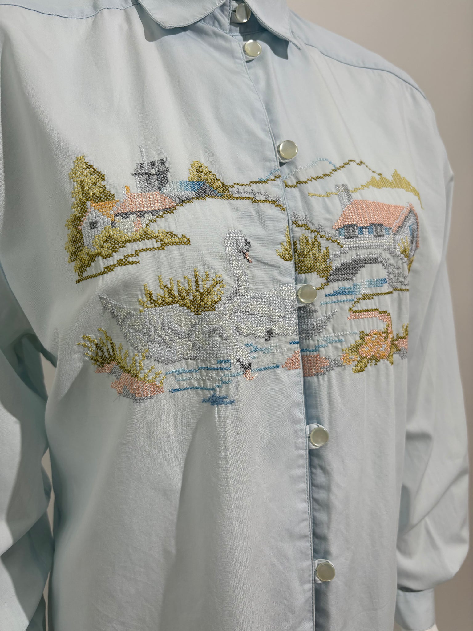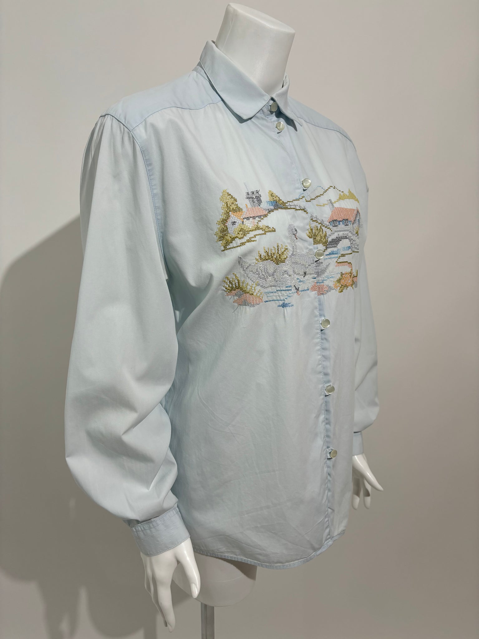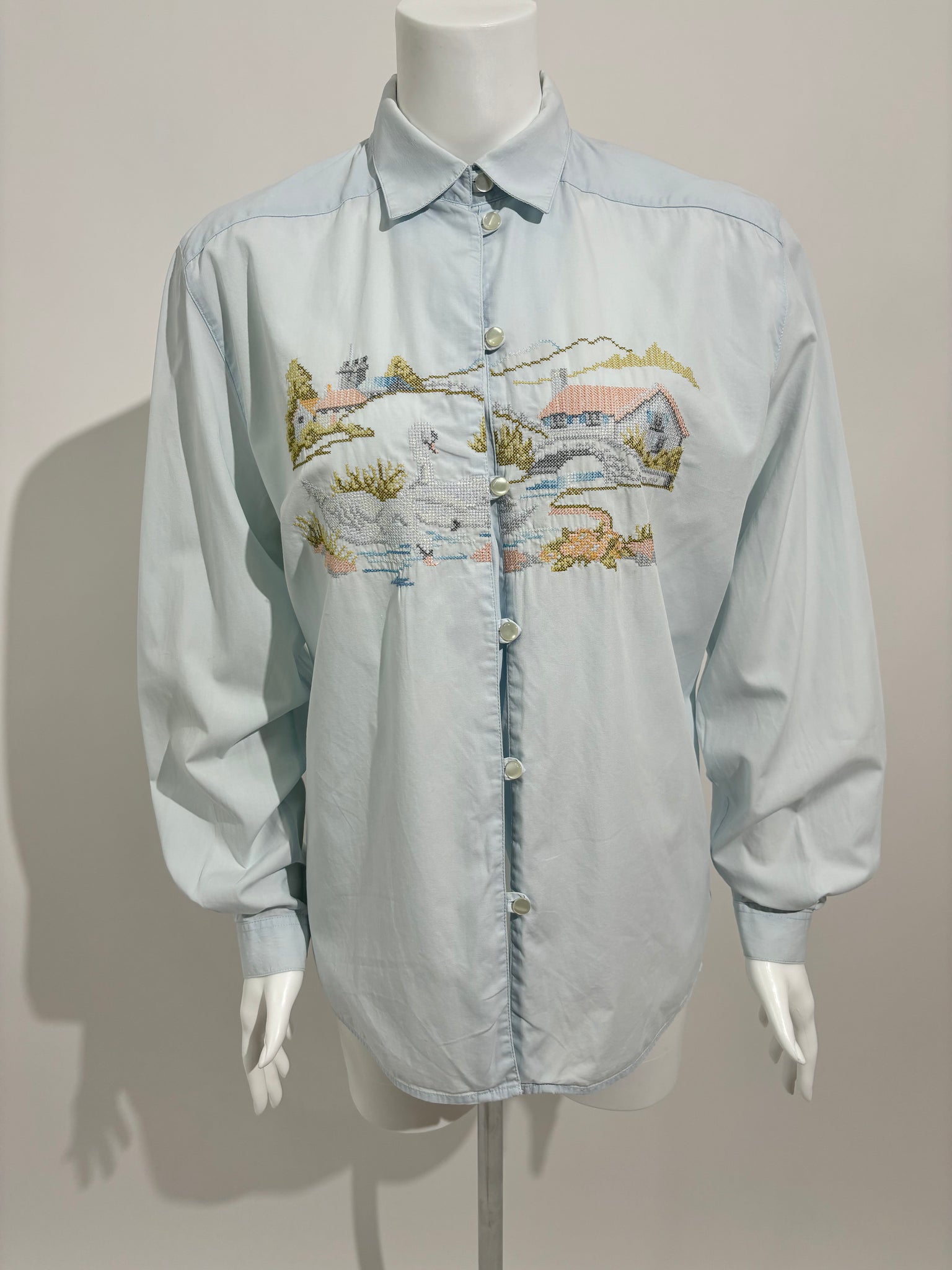 Uživajte u nostalgičnim trenucima sa ovom svetloplavom košuljom iz 80-ih sa delikatnim izvezenim pejzažem. Idealna za ljubitelje prirode i vintage stila.