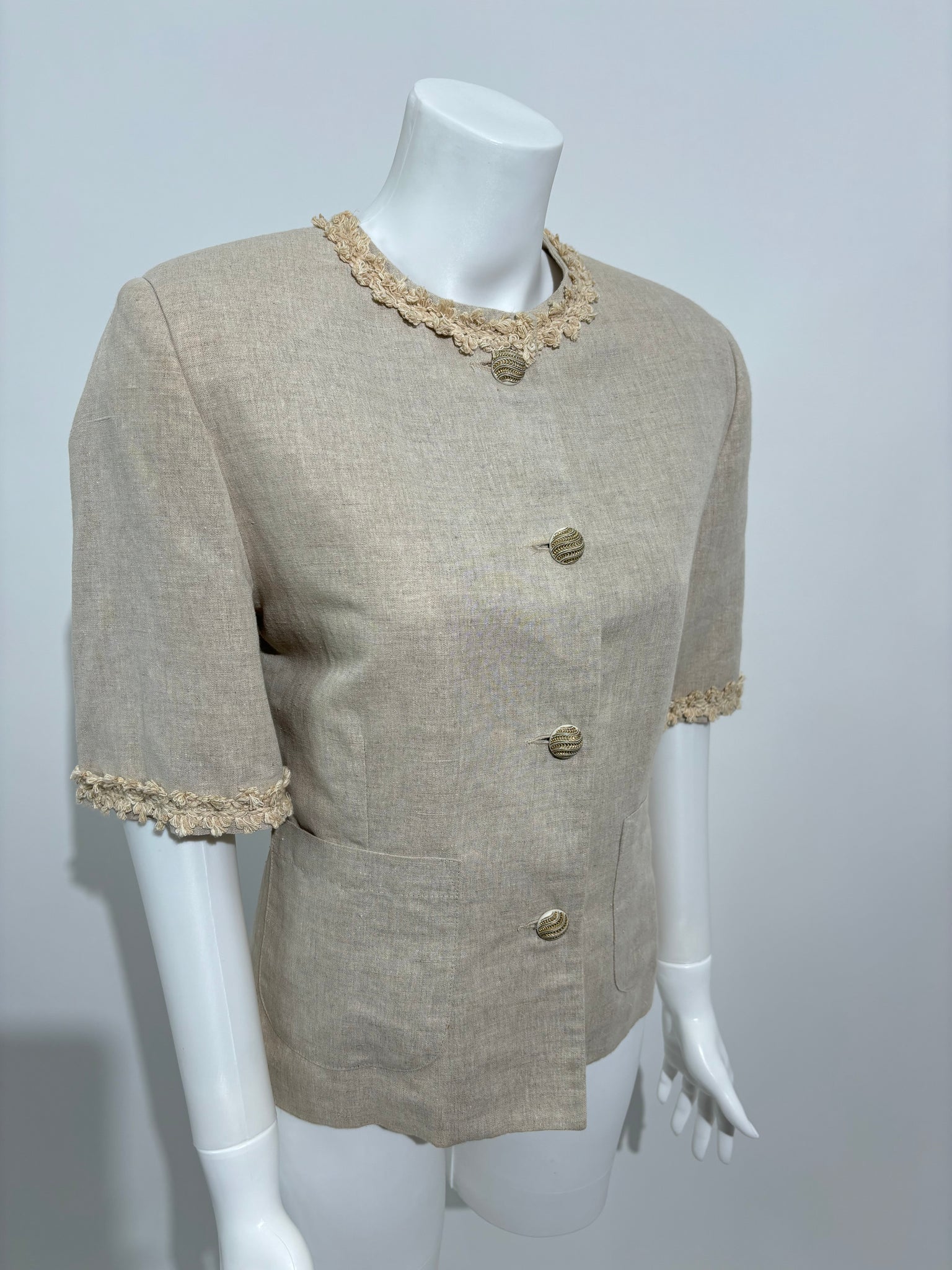Dodajte dozu rustične elegancije svom garderoberu sa ovom bež košuljom iz 80-ih, ukrašenom predivnim čipkanim detaljima. Savršena za formalne i casual prilike.