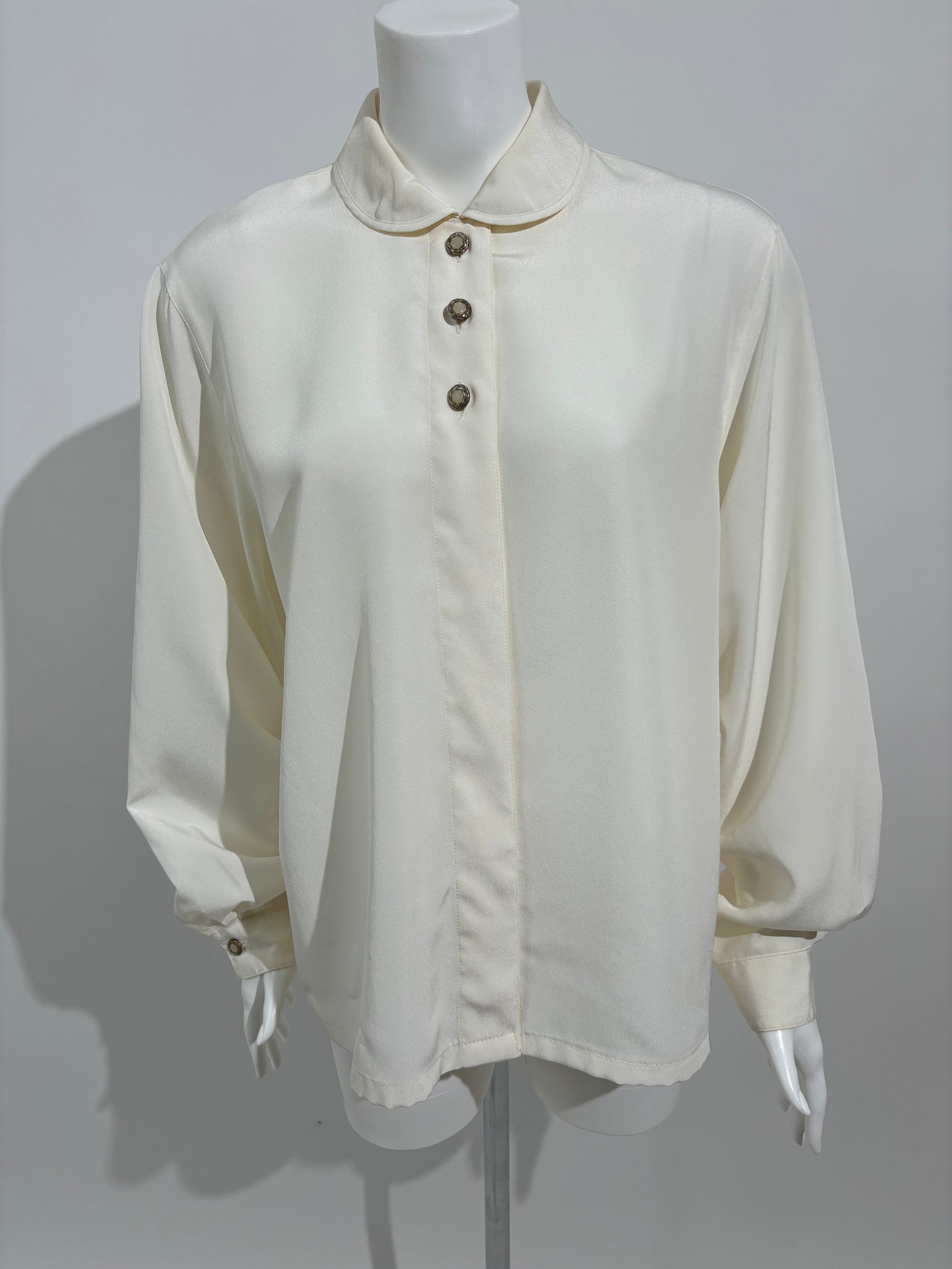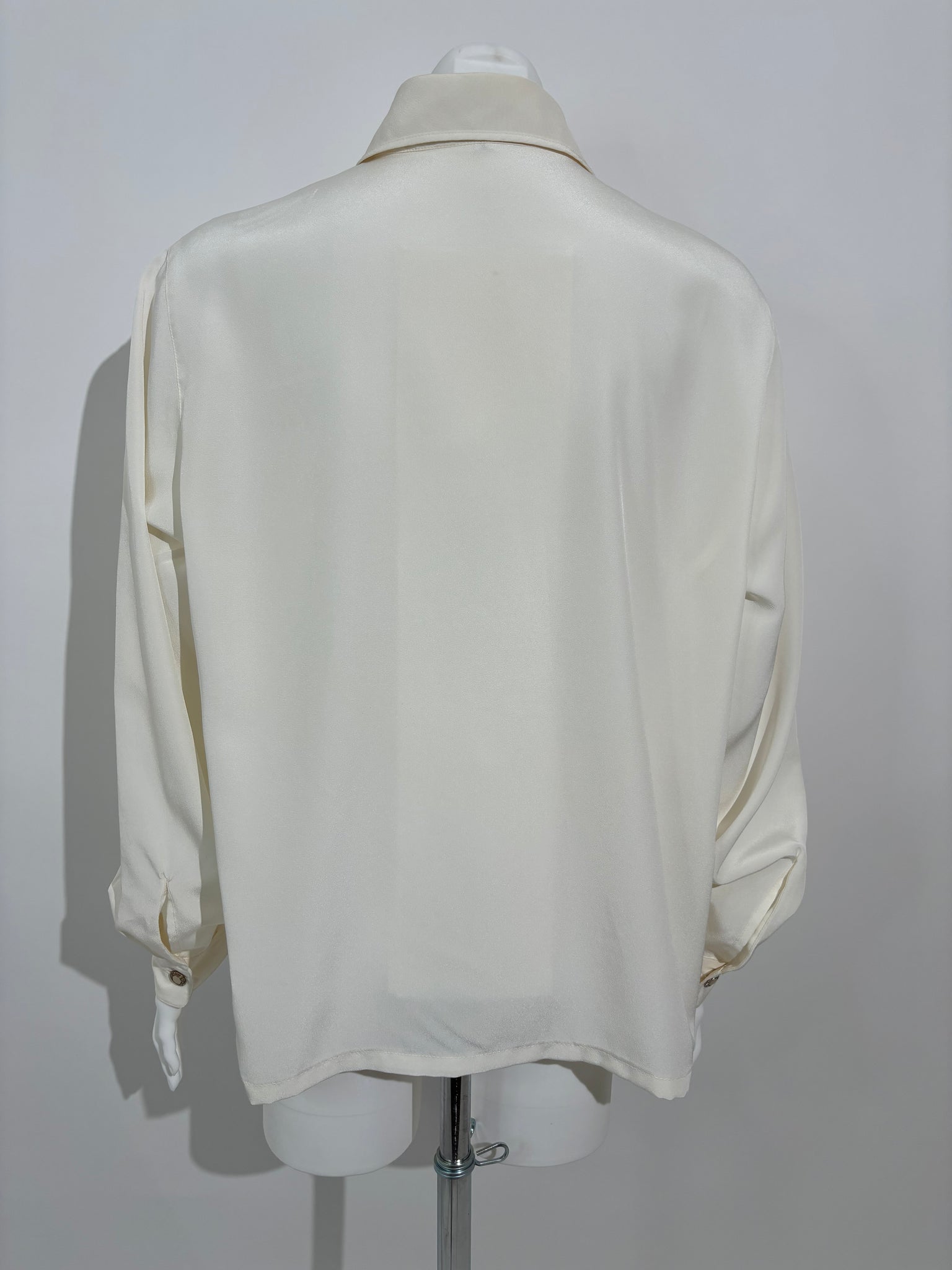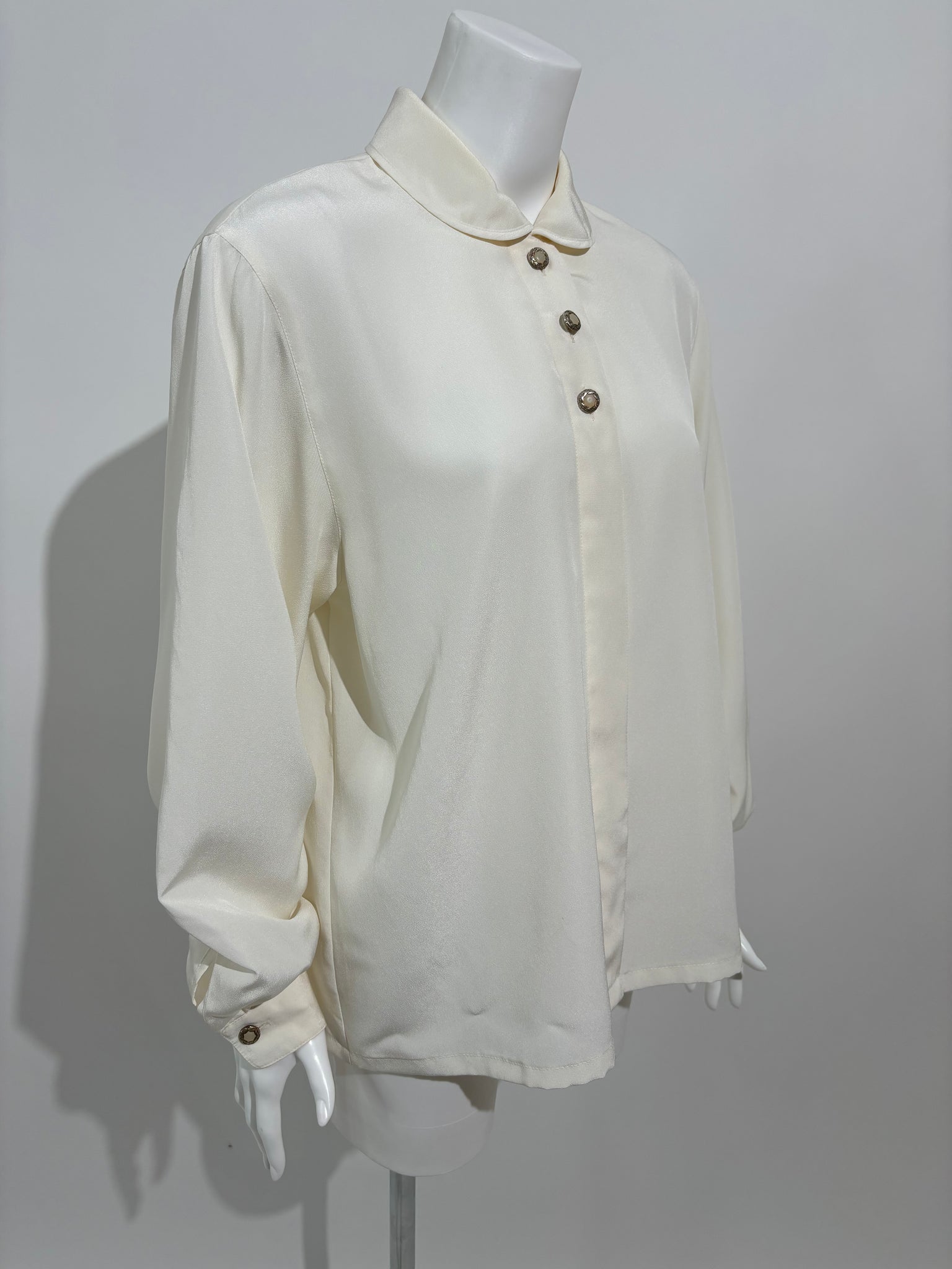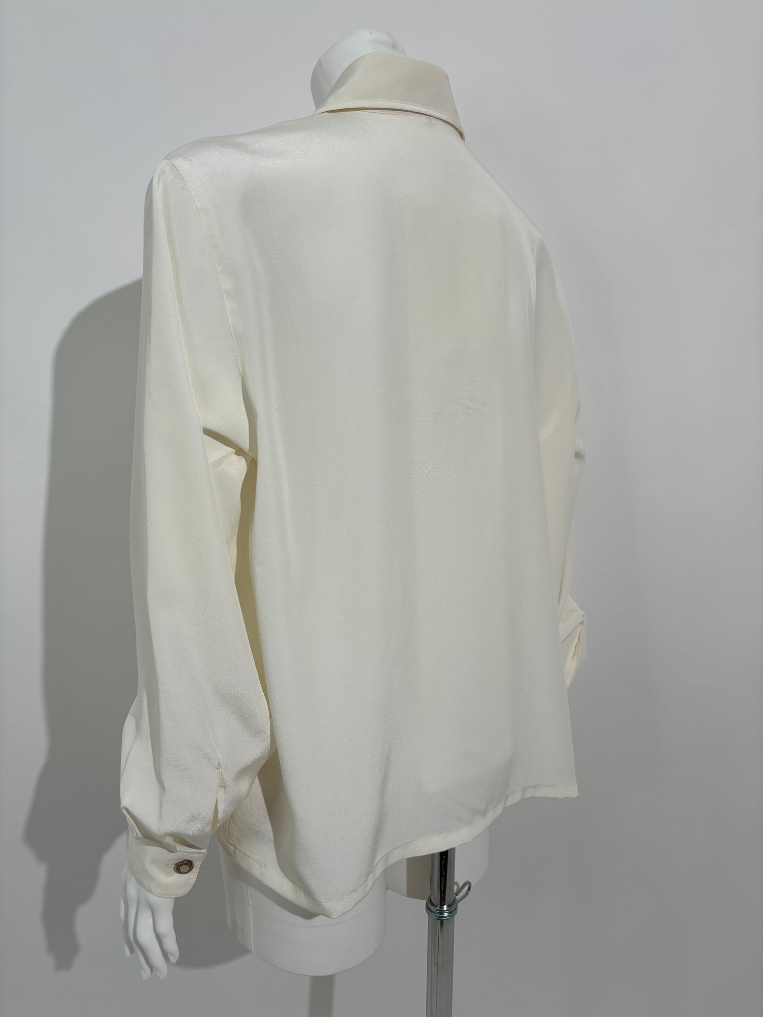 Dodajte sofisticiranost svom garderoberu sa ovom krem Laura Di Capri košuljom iz 80-ih, izrađenom od svile i ukrašenom klasičnim dugmićima. Savršena za formalne prilike i elegantne večeri.