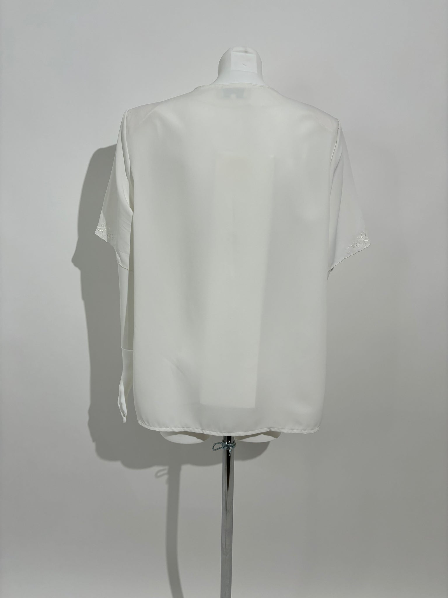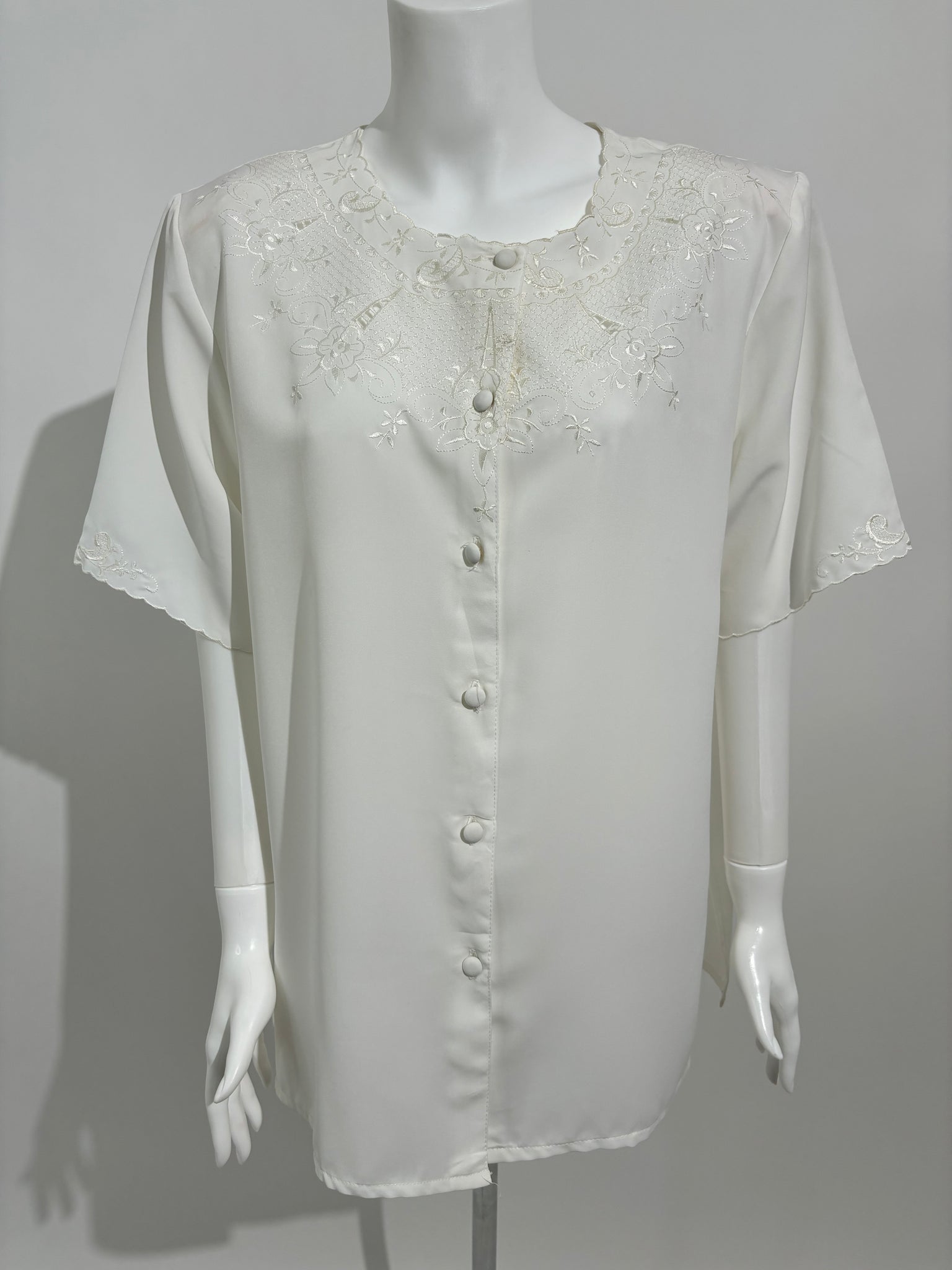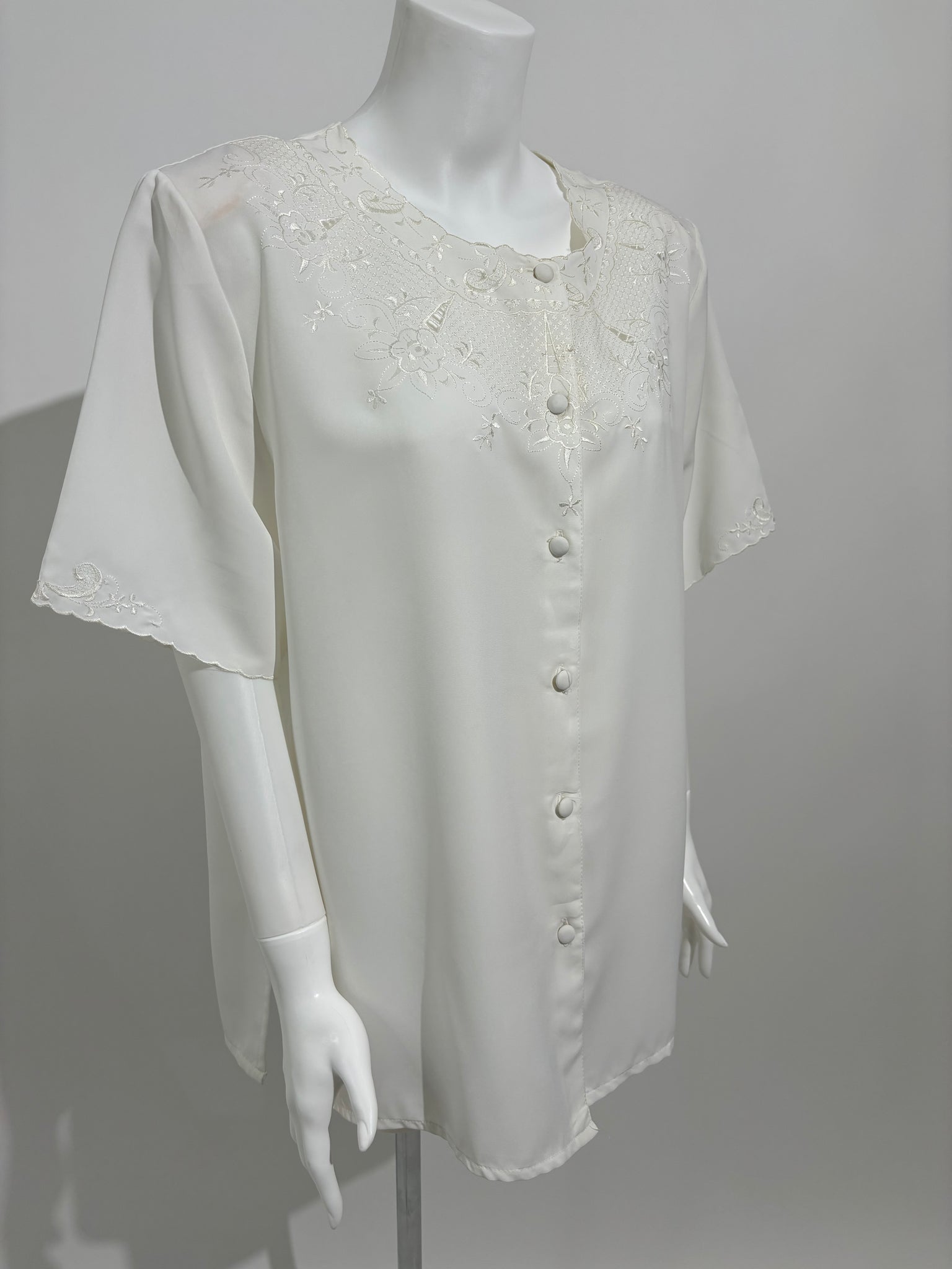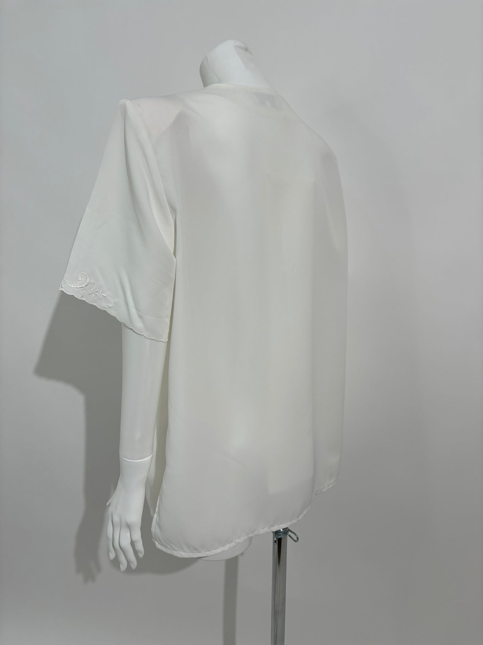 Dodajte dašak elegancije svom garderoberu sa ovom belom košuljom iz 70-ih sa delikatnim vezom. Savršena za formalne prilike i posebne događaje. Naramenice se mogu odšiti.
