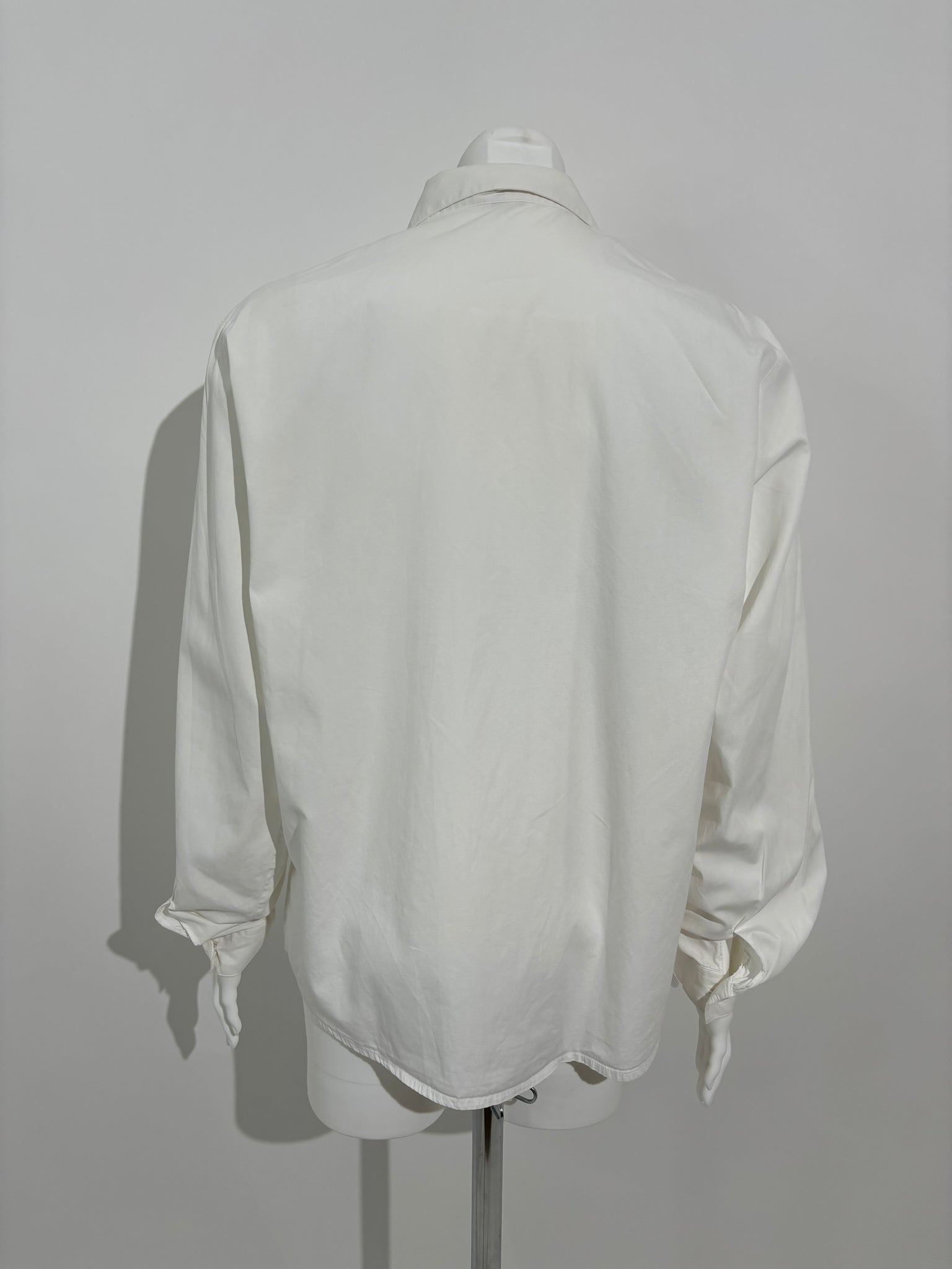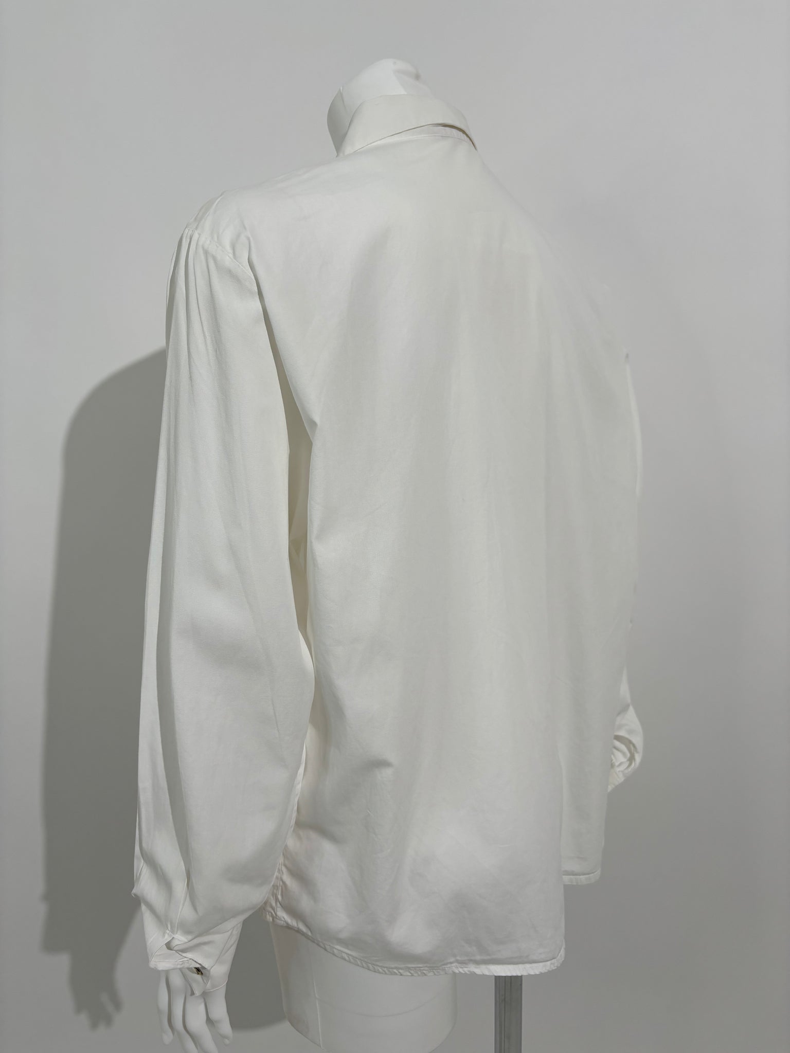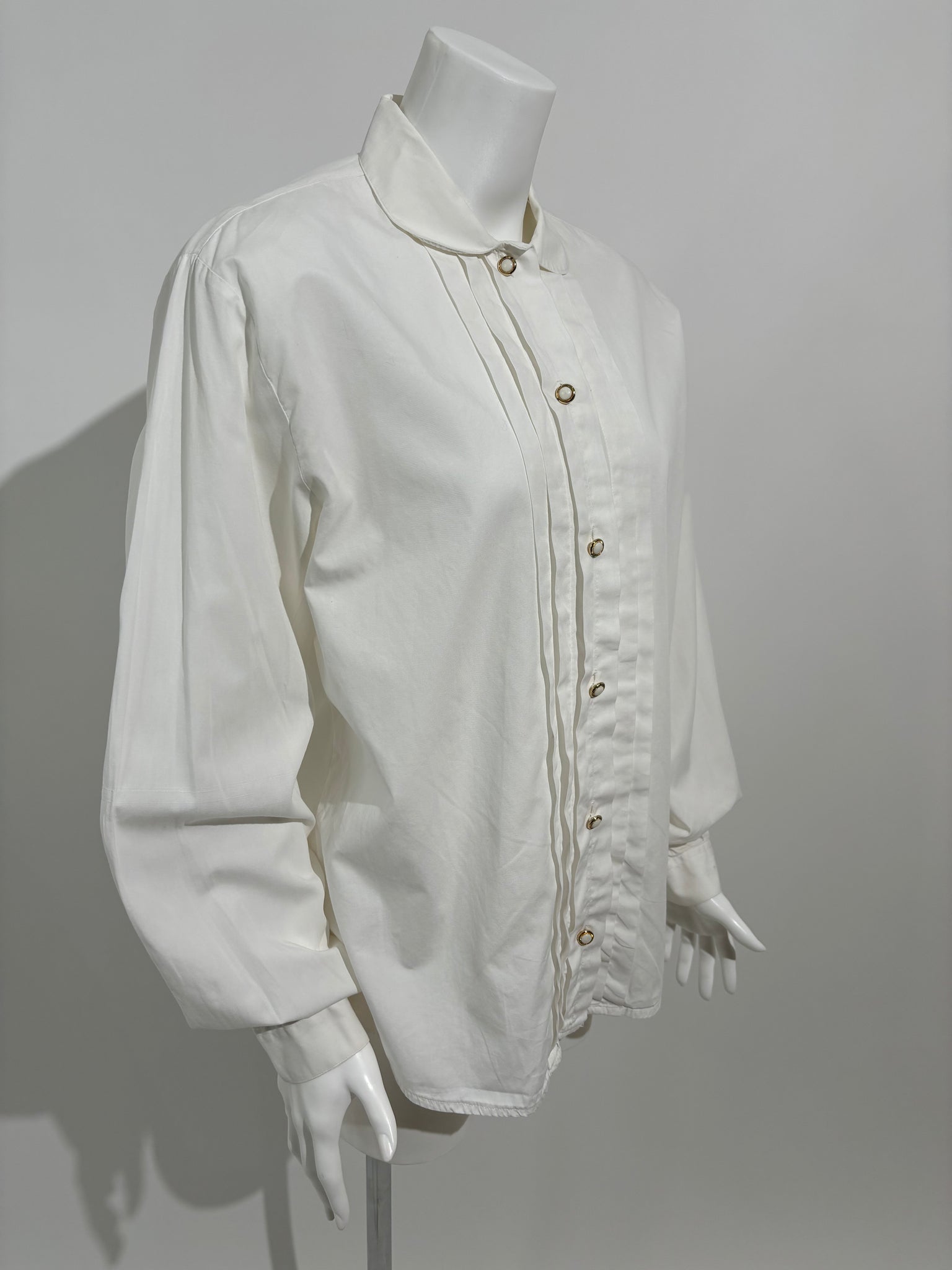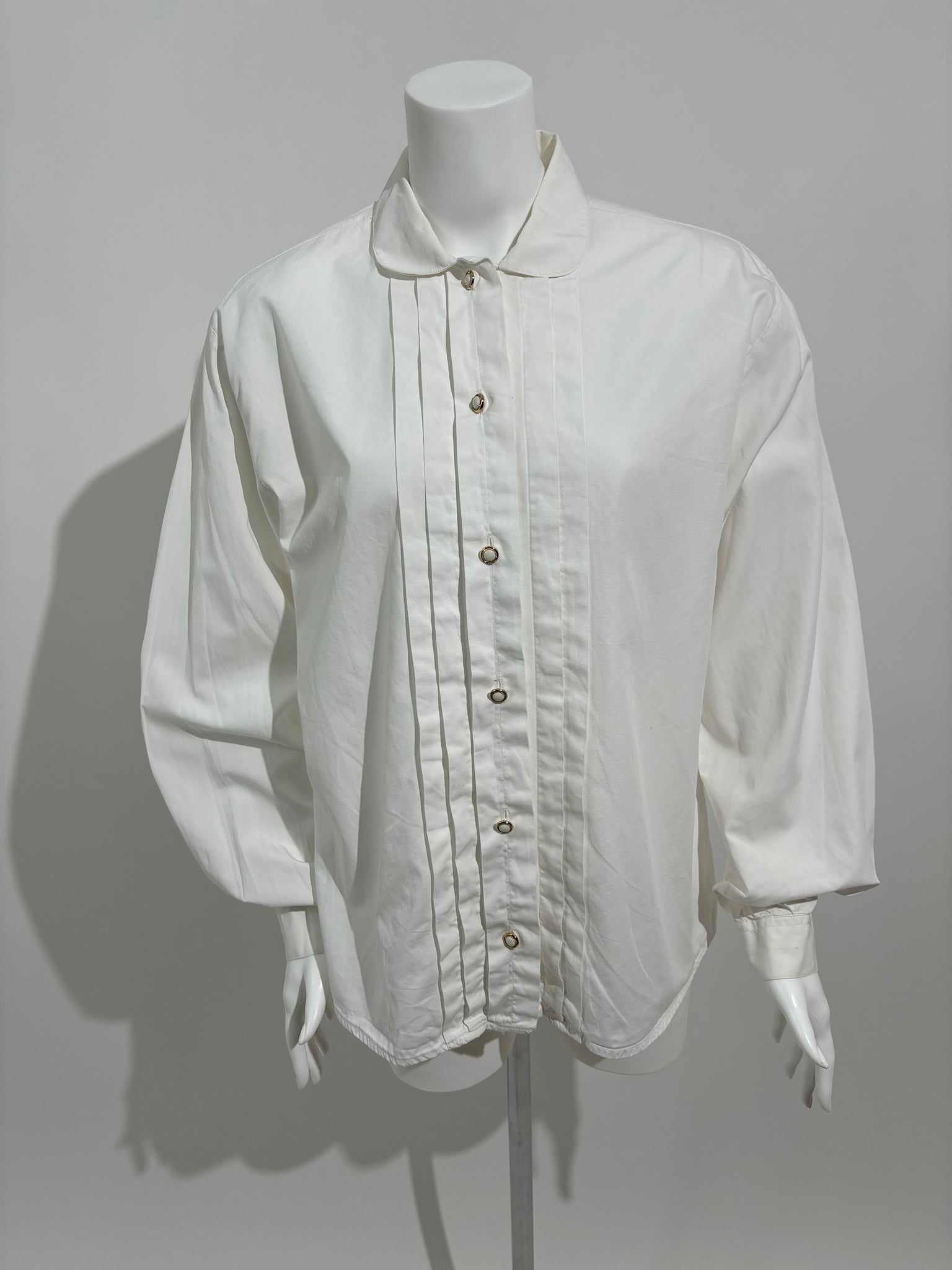 Dodajte dašak klasične elegancije svom garderoberu sa ovom belom košuljom iz 60-ih, ukrašenom plisiranim detaljima. Savršena za formalne i svakodnevne prilike. True Vintage.